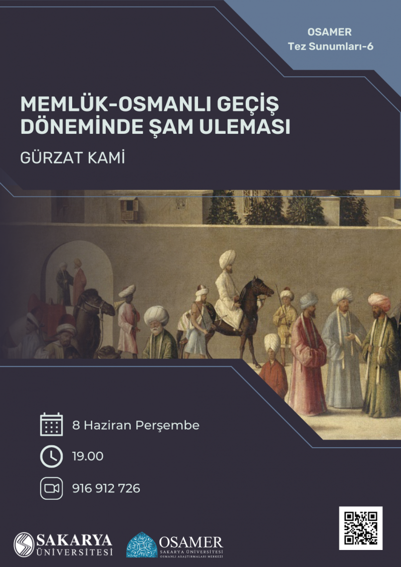 OSAMER Tez Sunumları serisinin altıncı seminerinde Doç. Dr. Abdurrahman Atçıl danışmanlığında Marmara Üniversitesi Tarih Bölümü'nde tamamladığı "Memlük-Osmanlı GeçiÅŸ Döneminde Åžam Uleması" baÅŸlıklı sunumuyla Dr. Gürzat Kami'yi ağırlıyoruz.