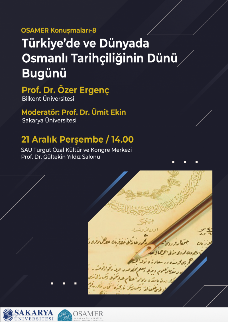 OSAMER KonuÅŸmaları'nın sekizinci seminerinde Bilkent Üniversitesi öÄŸretim üyelerinden Prof. Dr. Özer Egenç'i ağırlıyoruz. Prof. Dr. Ümit Ekin'in moderatörlüÄŸünde gerçekleÅŸecek etkinliÄŸimiz 21 Aralık PerÅŸembe günü saat 14.00'da SAU Turgut Özal Kültür ve Kongre Merkezi Prof. Dr. Gültekin Yıldız salonunda düzenleniyor.