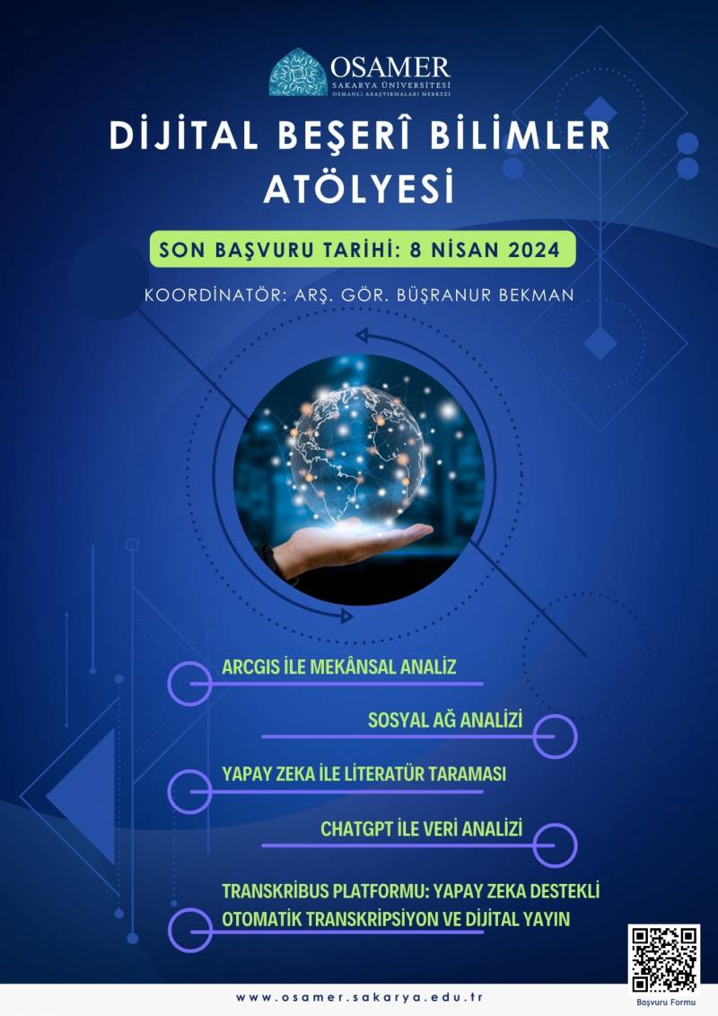 Osmanlı AraÅŸtırmaları Merkezi olarak araÅŸtırma görevlimiz BüÅŸranur Bekman'ın koordinatörlüÄŸünde, 17 Nisan - 2 Haziran 2024 tarihleri arasında gerçekleÅŸtirilecek olan özel bir atölye programına ev sahipliÄŸi yapmaktadır. Atölye öÄŸrencilere ArcGIS ile Mekânsal Analiz, Sosyal AÄŸ Analizi, ChatGPT ile Veri Analizi, Transkribus ile Yapay Zeka Destekli Otomatik Transkripsiyon ve Dijital Yayın alanlarında derinlemesine bilgi ve beceri kazandırmayı amaçlamaktadır.