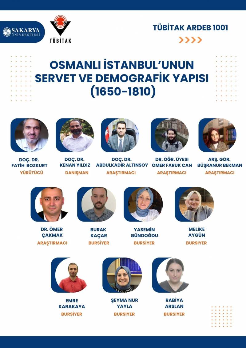 Yönetim Kurulu üyemiz Doç. Dr. Fatih Bozkurt'un yürütücülüÄŸünde; Doç. Dr. Kenan Yıldız'ın danışmanlığında, Doç. Dr. Abdulkadir Altınsoy, Dr. ÖÄŸr. Üyesi Ömer Faruk Can, Dr. Ömer Çakmak ve ekibimizden ArÅŸ. Gör. BüÅŸranur Bekman'ın araÅŸtırmacı olarak yer aldığı "Osmanlı İstanbul’unun Servet ve Demografik Yapısı (1650-1810)" baÅŸlıklı proje, TÜBİTAK 1001 kapsamında desteklenmeye hak kazandı.