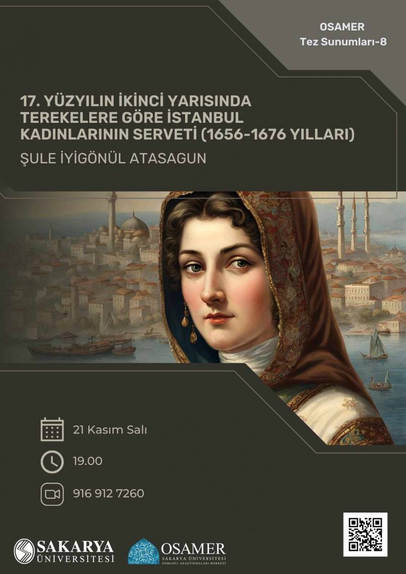 OSAMER Tez Sunumları serisinin sekizinci seminerinde Prof. Dr. Bilgin Aydın’ın danışmanlığında İstanbul Medeniyet Üniversitesi Tarih Bölümü'nde tamamladığı “17. Yüzyıl İkinci Yarısında Terekelere Göre İstanbul Kadınlarının Serveti (1656-1676 Yılları)” baÅŸlıklı doktora tez sunumuyla Dr. Åžule İyigönül AtasaÄŸun’u ağırlıyoruz.