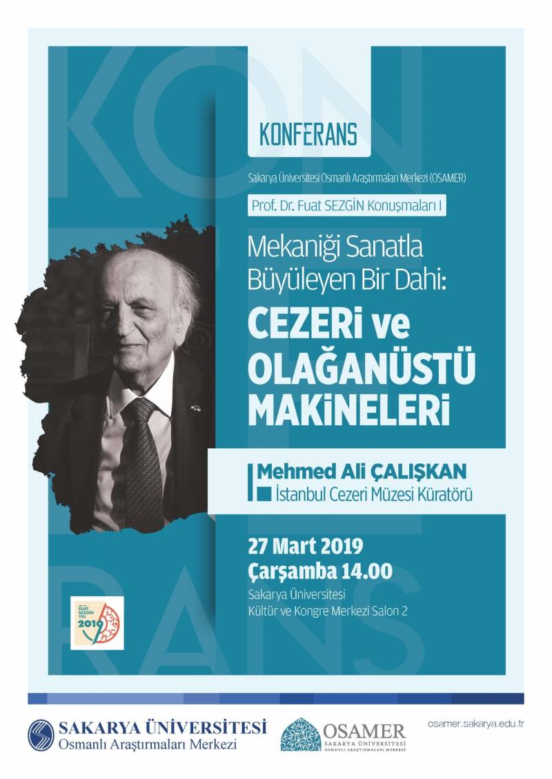 ‘2019 Prof. Dr. Fuat Sezgin Yılı’ etkinlikleri kapsamında SAÜ Kültür ve Kongre Merkezinde gerçekleÅŸtirilen etkinliÄŸe, İstanbul Cezeri Müzesi Küratörü Mehmed Ali Çalışkan konuÅŸmacı olarak katıldı. Etkinlik, zamanı aÅŸan fikirleri, bakış açısı ve felsefesiyle modern mekaniÄŸin ustası kabul edilen, Artuklu Sarayı’nın 26 yıl baÅŸmühendisliÄŸini yapmış İbni Rezzaz El Cezeri’nin olaÄŸanüstü makinelerini anlatan kısa film gösterimi ile baÅŸladı.