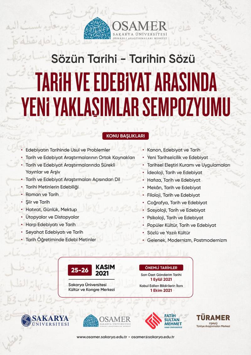 Sizleri 25-26 Kasım 2021 tarihlerinde Sakarya'da düzenlenmesi planlanan Sözün Tarihi-Tarihin Sözü: Tarih ve Edebiyat Arasında Yeni Yaklaşımlar Sempozyumu’na davet etmekten mutluluk duyarız.